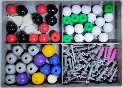 В набор входят 175 пластмассовых шаров разного цвета и диаметра (имитация атомов). На них имеются отверстия для соединительных стержней разных видов по длинне:125 металлических (для одинарных связей) и 10 металлических гибких (для моделирования двойных и тройных связей). Шары  и стержни разложены по пакетам и уложены в пластмассовый футляр на котором наклеена этикетка с маркировкой.