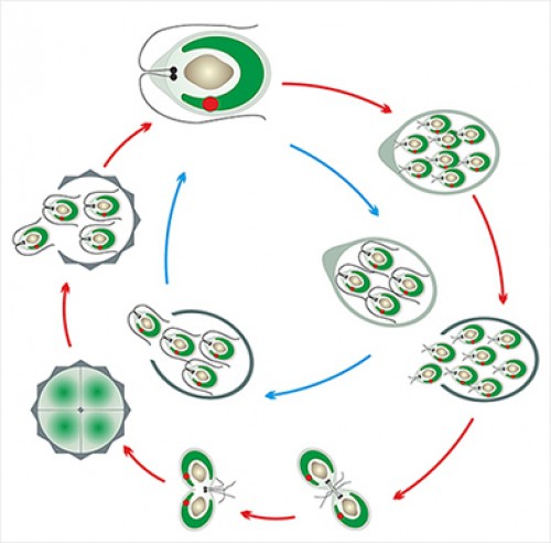 Размножается хламидомонада как бесполым, так и половым путем. Бесполое размножение осуществляется делением на 2-8 зооспор (на данной схеме 4 штуки). После деления оболочка хламидомонады разрывается и зооспоры выходят наружу.