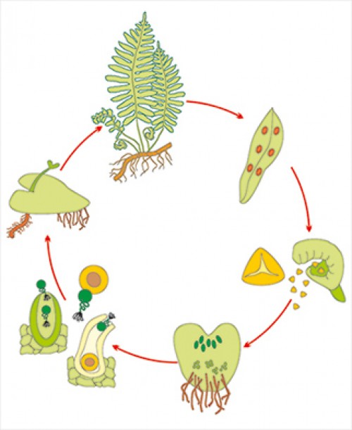 В цикле развития папоротника, как и в цикле развития мха, присутствуют два поколения - спорофит и гаметофит. Но, в отличие от мха, основным поколением, развивающимся большую часть цикла, является спорофит. Именно спорофит образует широкие листья-вайи, на пластинках которых развиваются многочисленные спорангии, называемые сорусами. Зрелый спорангий раскрывается, и из него высыпаются споры. Попав в благоприятную влажную среду спора прорастает, и из нее вырастает небольшое растение-гаметофит, называемое заростком. Именно в заростке происходит процесс полового оплодотворения. На нижней поверхности заростка формируются мужские органы, называемые антеридиями и содержащие сперматозоиды и женские, называемые архегониями и содержащие яйцеклетки. Сперматозоиды после дождя плывут, пользуясь жгутиками к архегонию и оплодотворяют яйцеклетку, образуя зиготу. Из зиготы развивается новый молодой спорофит. Это и есть то растение, которое мы называем папоротником.