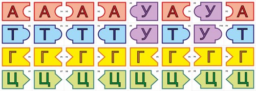 Пособие включает в себя 32 карточки (№ У1-У10). На карточках приведены обозначения азотистых оснований, три из которых: аденин (А), гуанин (Г) и цитозин (Ц) входят как в состав ДНК, так и в состав РНК, тимин (Т) встречается только в молекуле ДНК, а в молекуле РНК его заменяет урацил (У). Каждое азотистое основание приведено в двух вариантах: № У1, У3, У5, У7 предназначены для монтажа одной из цепи ДНК. Карточки № У2, У4, У6, У8 – для монтажа справа от нее второй цепи ДНК, согласно принципу копллементарности. Заменив карточки У8 на У9 можно собрать цепь РНК и продемонстрировать процесс транскрипции. Карточка № У10 предлагается ученикам при выполнении задания, описанного в пятом пункте схемы 1. (Это усложняет задание: если ученик, которому было задано смонтировать вторую цепь ДНК на правой стороне доски использовал данную карточку, учитель указывает ему на ошибку: урацил не может входить в состав молекулы ДНК).