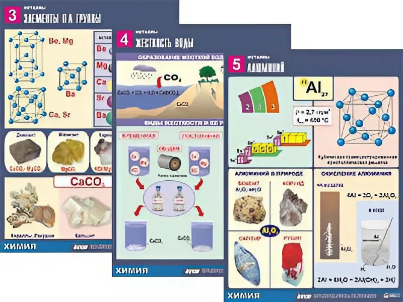 Комплект охватывает следующие темы: "Щелочные металлы", "Химия щелочных металлов", "Элементы IIА группы", "Жесткость воды", "Алюминий", "Применение алюминия", "Железо", "Виды коррозии", "Методы защиты от коррозии", "Общие свойства металлов".