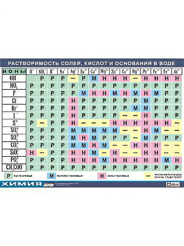 Таблица демонстрационная "Растворимость солей, кислот и оснований в воде" (винил 70х100) - fgospostavki.ru - Казань