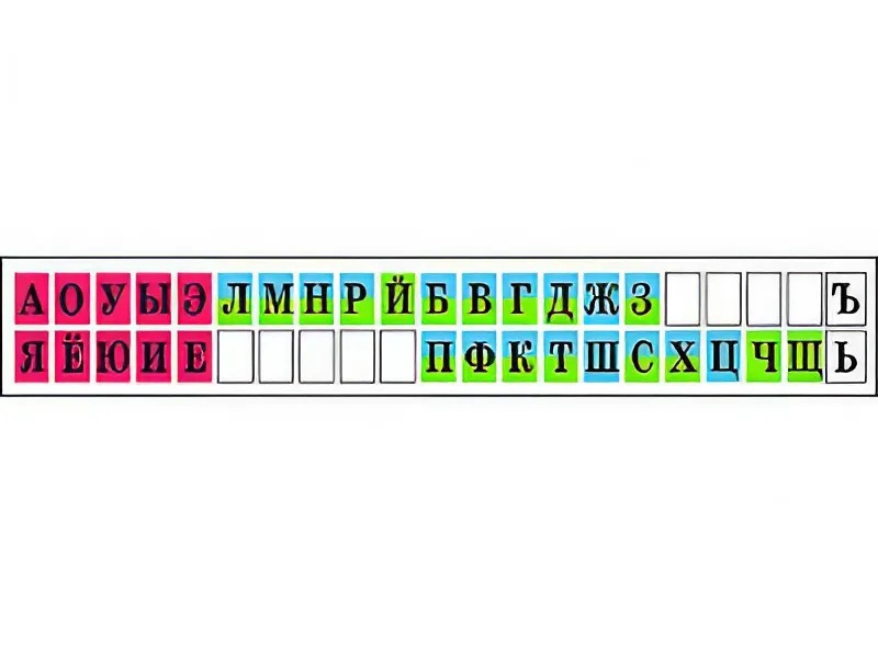Пособие представляет собой полотно с напечатанными в определённом порядке буквами русского алфавита. В левой части располагаются гласные (на красном фоне), в правой – согласные (на синем, зеленом или сине-зеленом фоне в зависимости от твердости-мягкости звуков, которые они обозначают). В верхнем ряду расположены гласные, обозначающие твердость согласных звуков на письме, а в нижнем – мягкость. Также в верхнем ряду расположены буквы, обозначающие звонкие согласные, а в нижнем – глухие. Мягкий и твердый знаки напечатаны на белом фоне.