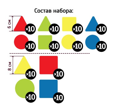 Набор магнитных карточек "Геометрические фигуры: изучаем форму, цвет, размер" (120 карточек, 4 цвета)