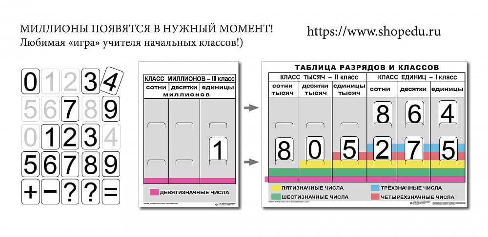 Разряды и классы чисел (I,II,III класс). Комплект иллюстрирует 3 класса (единиц, тысяч и миллионов)