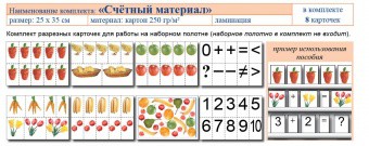 Комплект предназначен  для организации устного счета, сравнения групп предметов, схематической записи задач в начальных классах и подготовительных группах детских садов. Для применения комплекта в качестве демонстрационного материала рекомендуется использовать наборное полотно.