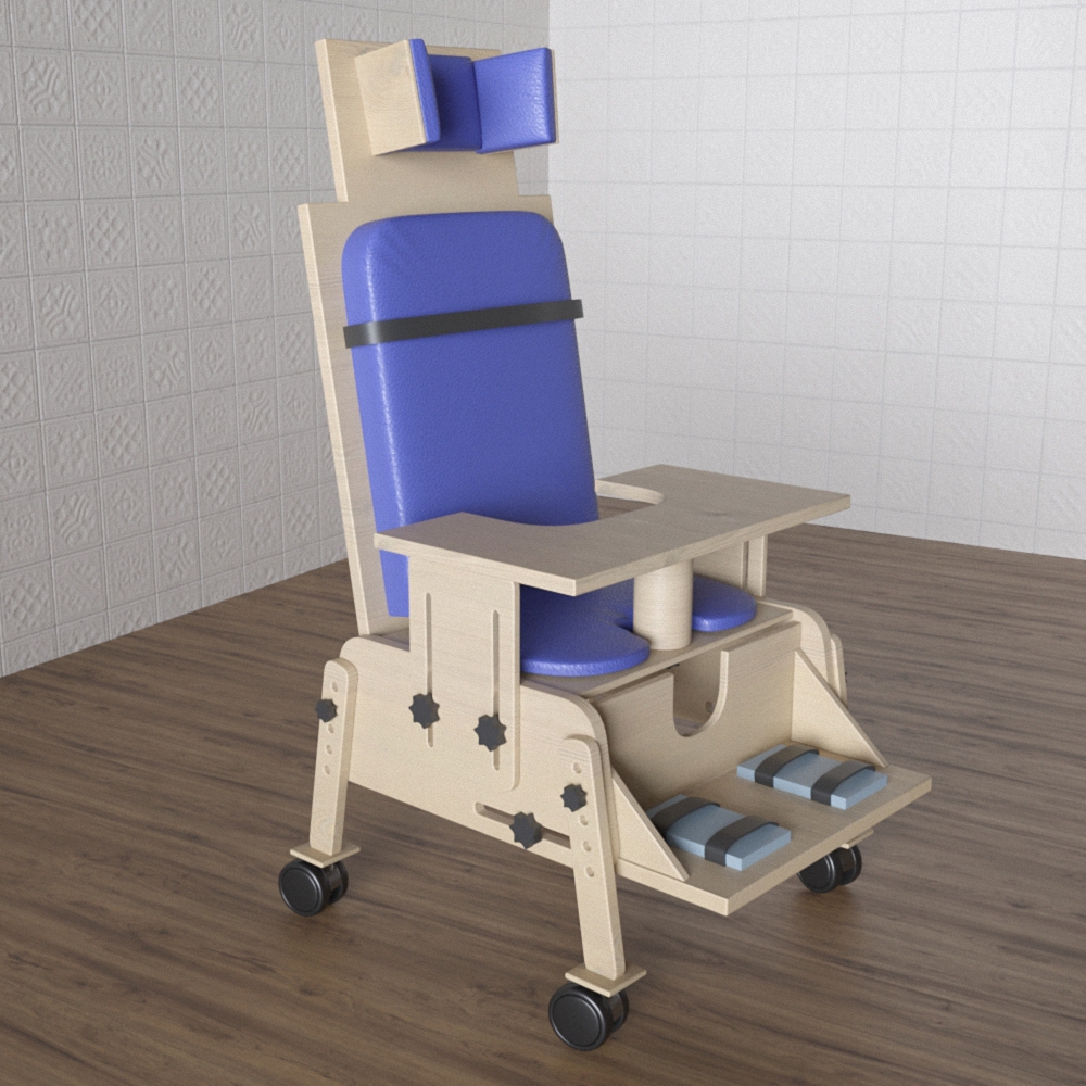 Конструкция стула «Новые горизонты» №3 предполагает самостоятельность – в комплекте есть небольшой столик, на котором можно разместить учебник, или использовать его в качестве обеденного. Столешницу, ножки стула и подножку можно отрегулировать до нужной высоты. Разработан для детей с ДЦП и прочими нарушениями двигательного аппарата как адаптационный модуль. Оснащен фиксаторами головы, плечевого пояса и стоп. Мобилен благодаря колесикам. Предназначен для оборудования кабинетов специалистов, занимающихся реабилитацией детей с ОВЗ, учебных помещений в центрах коррекции и реабилитации.