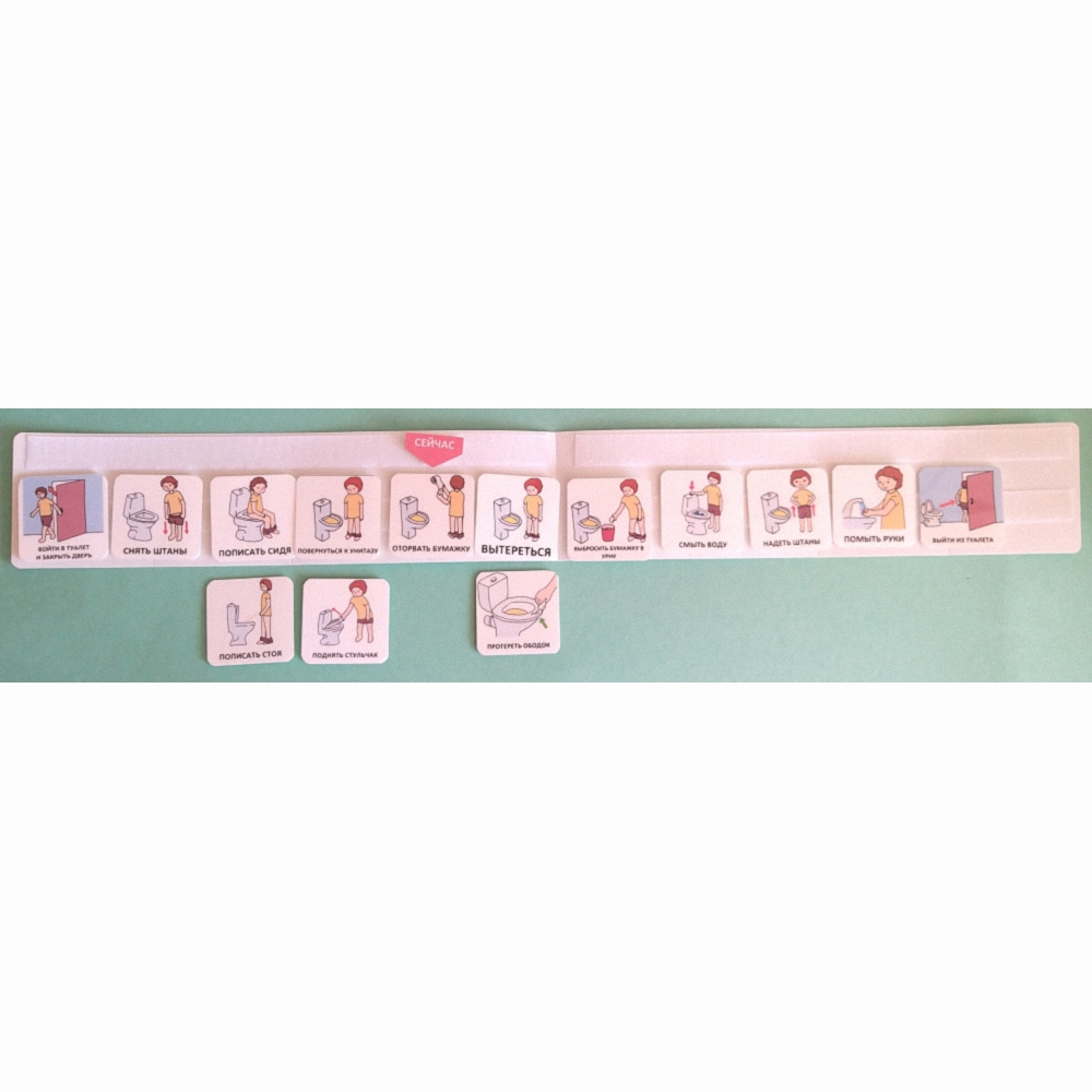 Самостоятельность в туалете - очень важный навык. Визуальная последовательность поможет как на ранних этапах обучения - пояснит какие действия нужно выполнять. И может остаться в качестве подсказки тогда, когда навык будет освоен.