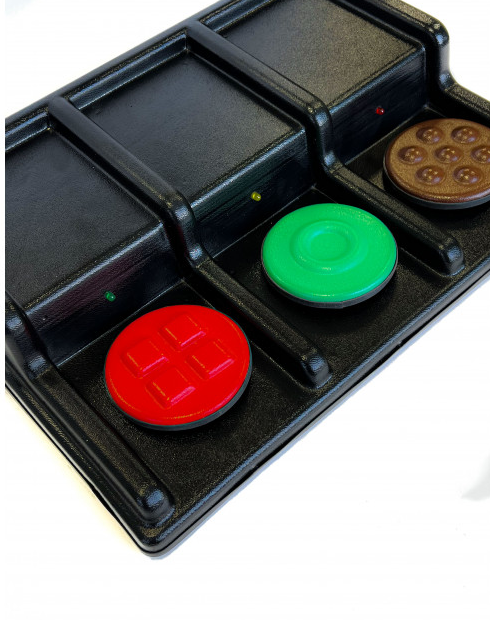 Коммуникатор этой модели имеет 2-х ступенчатую конструкцию: на нижней ступени расположены кнопки, верхняя же предназначена для размещения объемных предметов для изучения. Держатели для карточек в количестве 3 штуки помогают размещать и демонстрационные картинки с надписями или без, а также слова. Для каждой кнопки можно записать по одному сообщению до десяти секунд каждое. Данный аппарат подходит для проведения занятий по любому предмету, в котором могут быть задействованы наглядные материалы. При нажатии на кнопку сообщение воспроизводится и загорается свет. Подобные устройства имеют большую популярность во многих реабилитационных и коррекционных учреждениях нашей страны. Они во многом упрощают работу специалистов и делают ее более эффективной. Что касаемо людей с ограниченными возможностями, коммуникаторы способны подарить им веру в собственные силы, которая побуждает их развиваться и достигать новых высот.