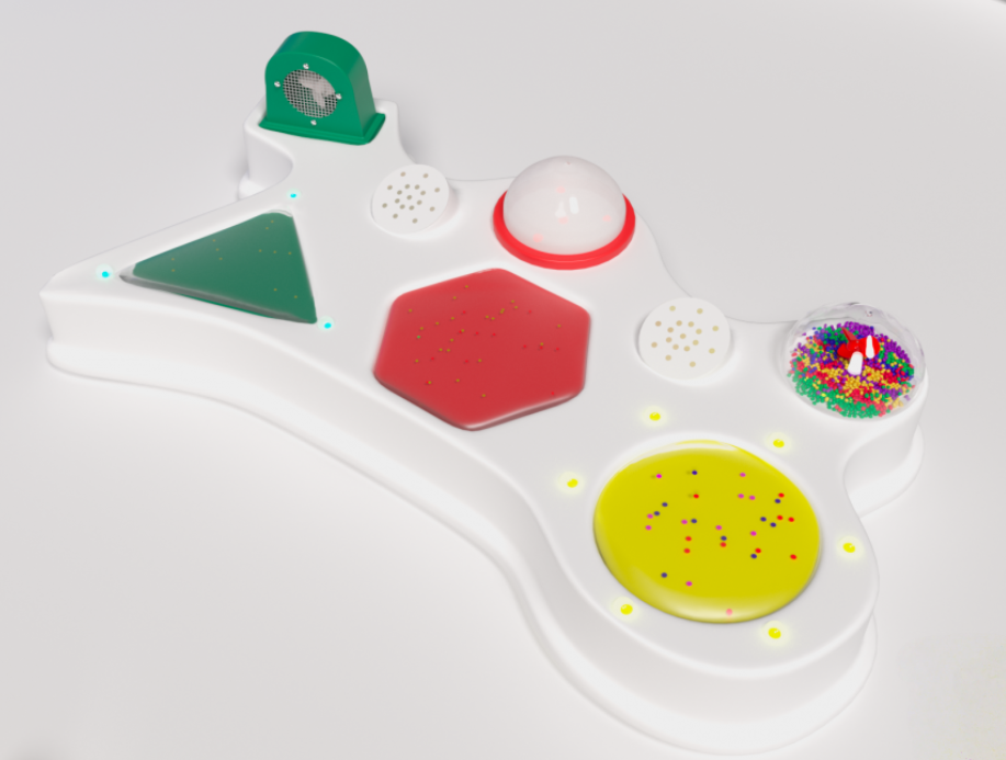 Развивающий центр с мягкими гелевыми кнопками предназначена для детского общего развития и развития детей, имеющих проблемы со слуховым, зрительным, тактильным восприятием и коммуникацией. Представляет собой слегка изогнутый корпус, на котором размещены 3 кнопки с приятной гелевой текстурой, 2 вентилятора и светодиодные лампочки. Изготовлено из высококачественного ударопрочного пластика, имеет обтекаемые плавные формы без острых краёв и углов.