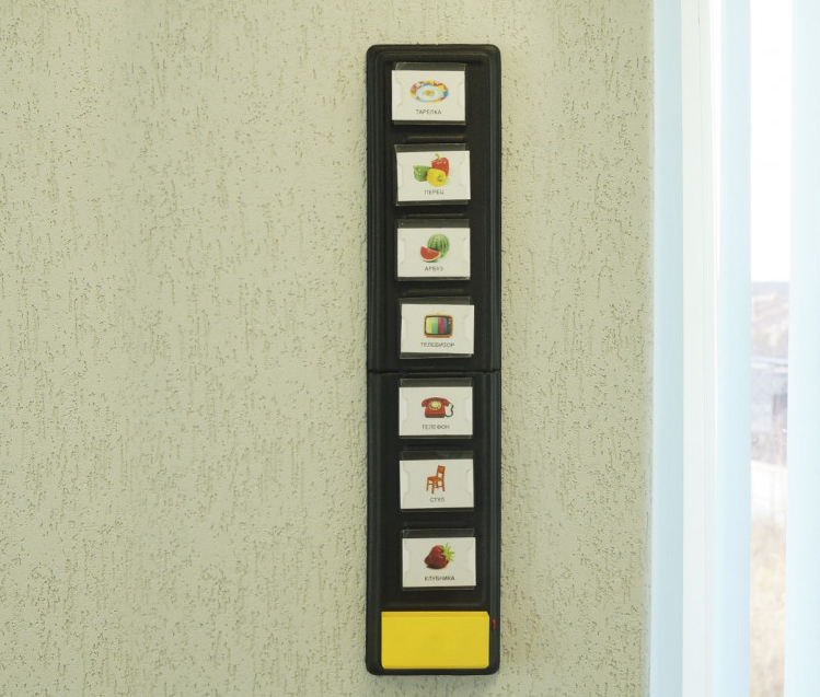Обучающий семикнопочный настенный игровой коммуникатор со съемными символами, это программируемое устройство предназначенное для записи и воспроизведения голосовых сообщений. Устройство имеет вертикальную конструктивную плоскость с 7 кнопками-карманами, которые в свою очередь могут отстегиваться (кнопки крепятся к поверхности на липучке). В карманы можно вставлять различные тематические карточки, и нажимая на них записывать/воспроизводить голосовые сообщения.