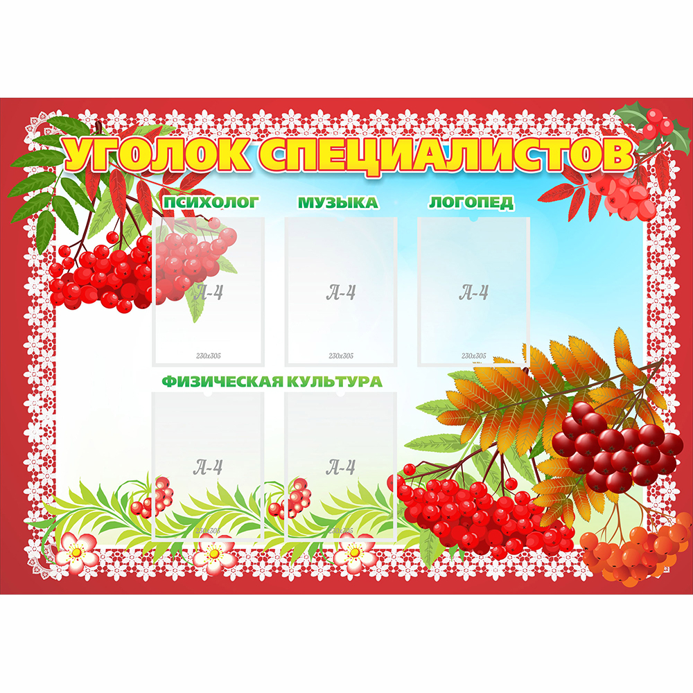 Ярко украшенный гроздьями рябины стенд предлагает рекомендации, объявления и прочую информацию от специалистов: психолога, музыкального руководителя, логопеда и инструктора по физической культуре. Информационные листы можно разместить в 5 прозрачных пластиковых карманах.