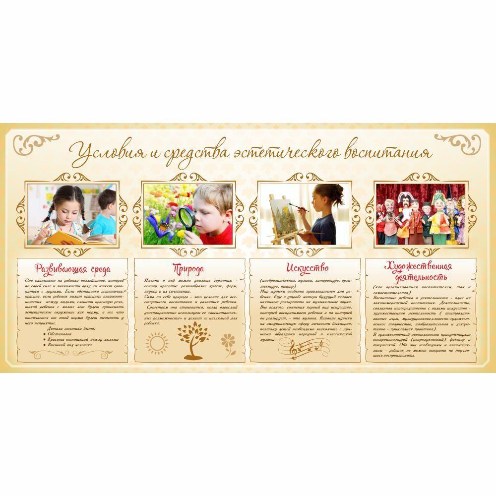 Одной из важных задач, стоящих перед коллективом сотрудников дошкольных учреждений, является эстетическое воспитание детей. Предлагаемый стенд может располагаться в методическом кабинете или возле кабинета заведующей детского сада и послужит хорошим методическим пособием при планировании занятий по данной теме.