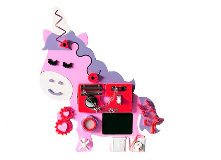 Развивающая игрушка-бизиборд в виде единорога— это надежный помощник родителей в полезных, веселых и совместных играх с детками. Благодаря различным элементам ребенок играет и развивает мелкую моторику, учится двигать предметы, управлять и контролировать свои движения. У бизиборда нет острых углов, гладкая поверхность не оставляет заусенцы.