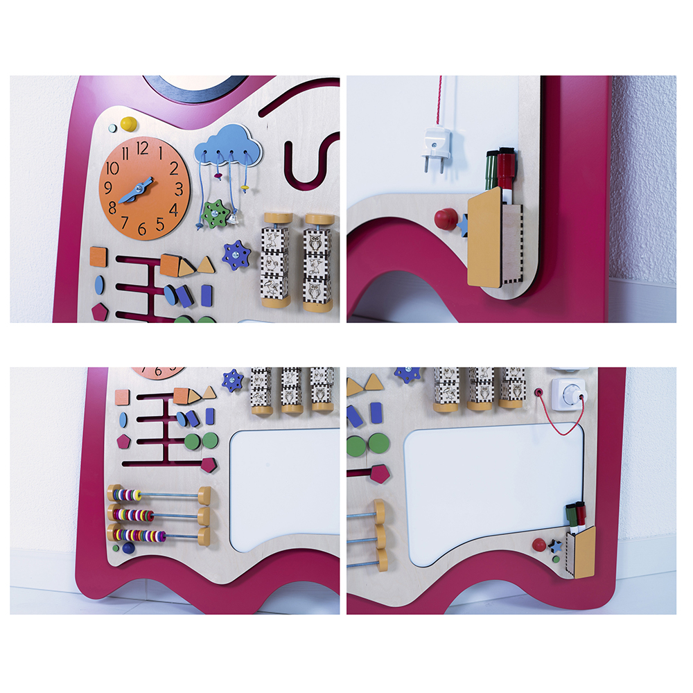 Бизиборд «Вит» для детских садов и школ предназначен для развития не только мелкой моторики, но и интеллектуальных навыков. Задачи строятся по принципу «от простого к сложному». Например, изучив геометрические фигуры, можно попробовать изобразить их самостоятельно. После изучения цифр от 1 до 10 можно перейти на следующий уровень, и, разобравшись, как работают счеты, складывать и вычитать десятки и сотни. А если детей несколько, то они могут сыграть на одной из панелей в крестики-нолики.