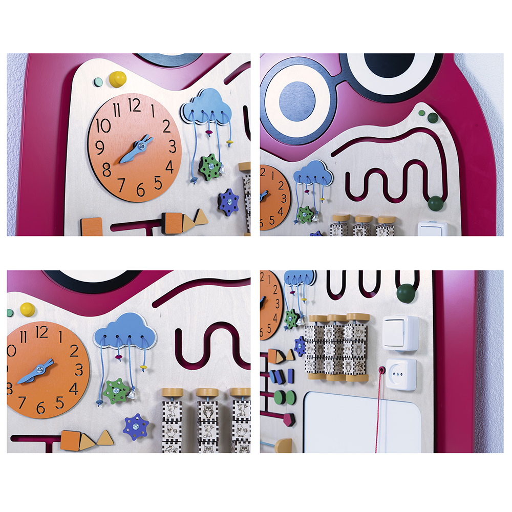 Главная задача бизибордов: помочь детям безопасно освоить предметы быта (защелки, крепления, механизмы, переключатели, часы). На упрощенных тренажерах с привлекательными рисунками дети развивают мелкую моторику, оттачивают мастерство, чтобы в дальнейшем применить полученный навык на практике.
