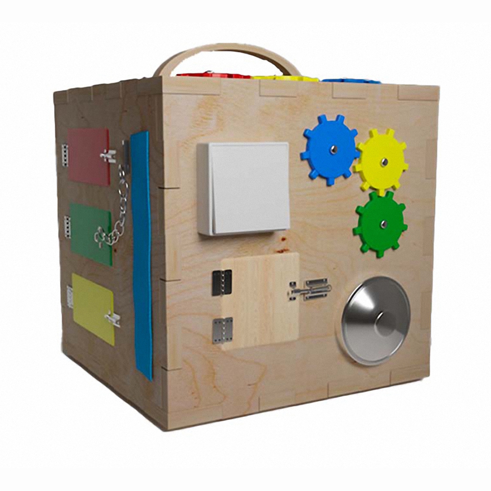 Игра развивает мелкую моторику и мышление детей разных возрастов, прекрасно подойдет для самостоятельной игры, а также для занятий с мамой и педагогом в детском саду, разнообразит занятия с логопедом и психологом, развивающем центре и не только, а также украсит любую детскую комнату. Самые необходимые элементы, которые входят в состав этой модели бизикуба, влияют с положительной стороны на развитие ребенка. Этот бизикуб выполнен из безопасных и прочных материалов: текстиля, металла и дерева, что позволяет пользоваться игрой с раннего возраста.