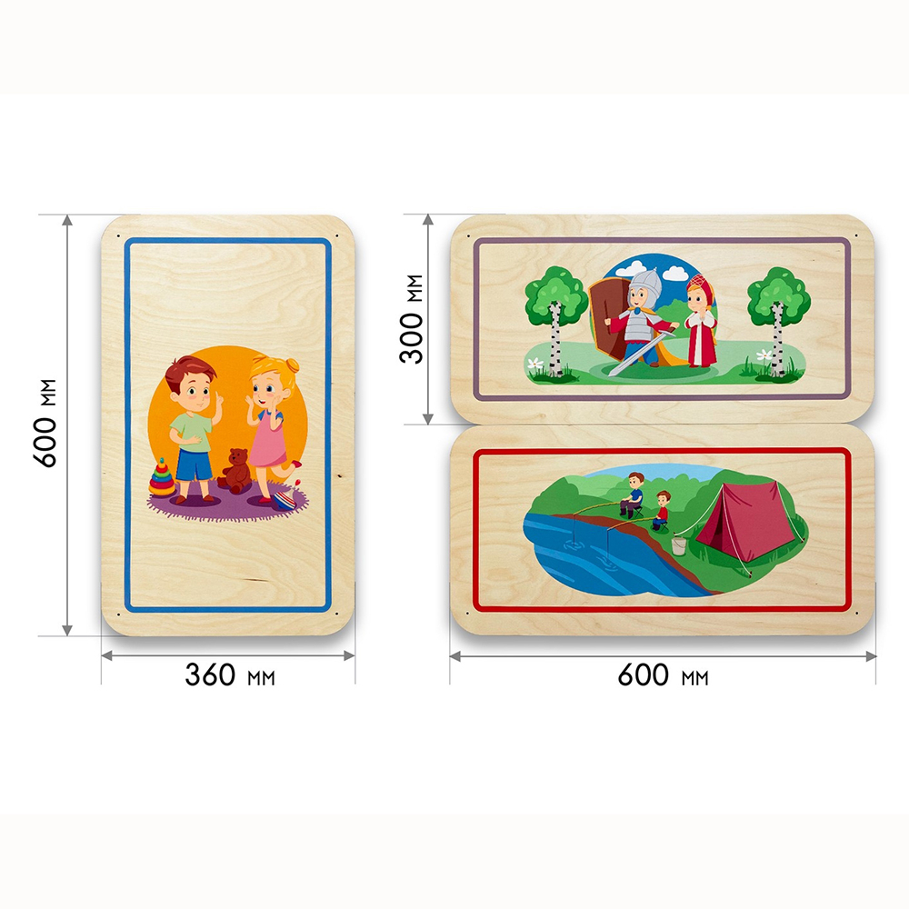Дополнительные модули бывают однотонные и с тематическими иллюстрациями, подходящими под тематику дидактических панелей. Разнообразие размеров способствует декорированию стен различной конфигурации и масштабов. Параметры варьируются от совсем маленьких модулей 300х300 мм до крупных размеров 600х600 мм.