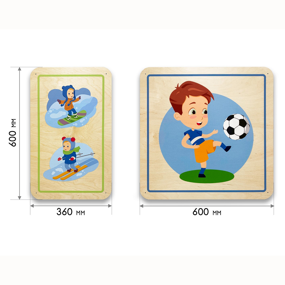 Дополнительные модули бывают однотонные и с тематическими иллюстрациями, подходящими под тематику дидактических панелей. Разнообразие размеров способствует декорированию стен различной конфигурации и масштабов. Параметры варьируются от совсем маленьких модулей 300х300 мм до крупных размеров 600х600 мм.