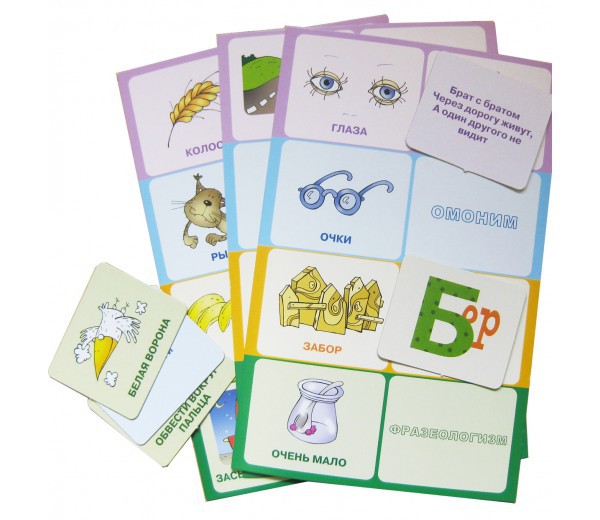 Двенадцати больших карточек с пословицами и фразеологизмами, с омонимами и загадками хватит даже на большую компанию!