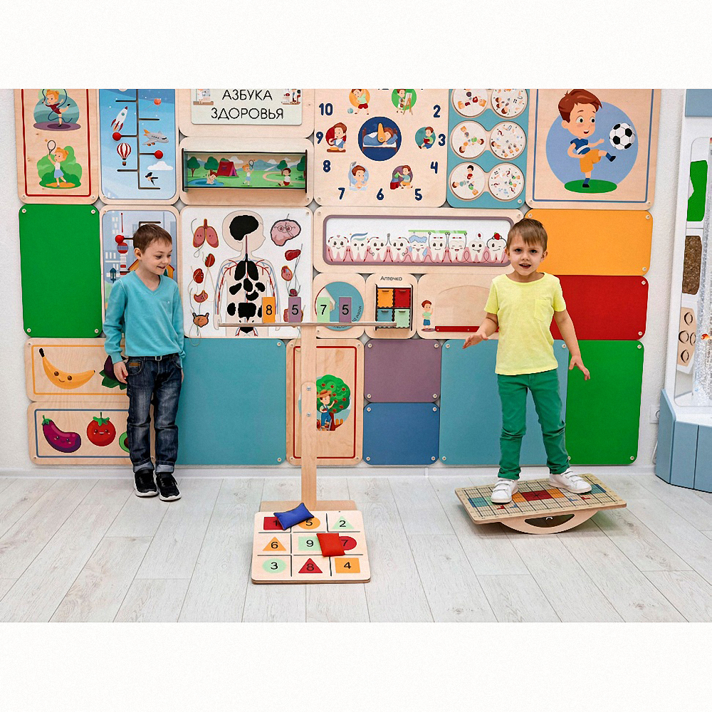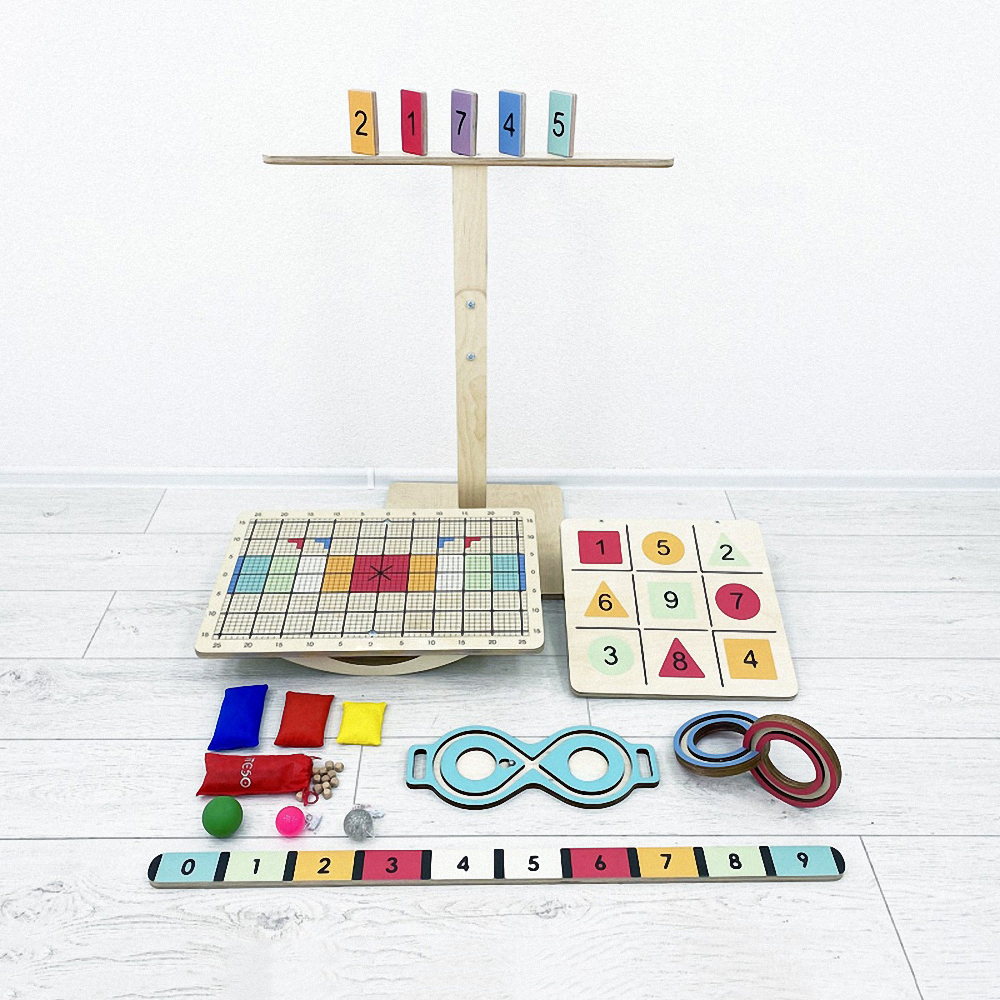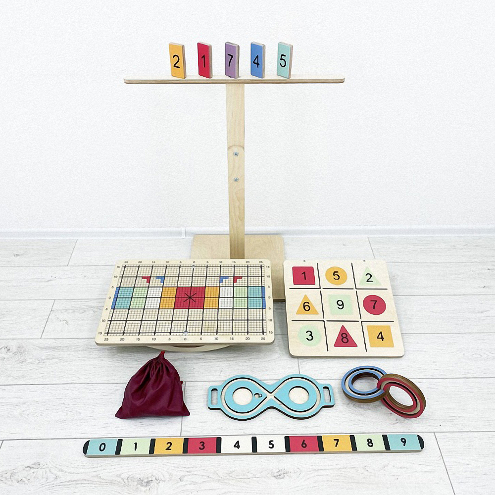 Комплект состоит из оригинальной доски Бильгоу с дополнительным инвентарём и тренажёров для развития мозга – нейровосьмёрки и 3D-восьмёрки. Он подходит для оборудования кабинета детского психолога, логопеда, физиотерапевта.