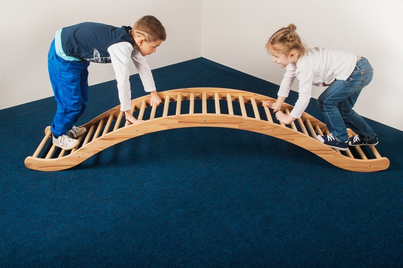 С этой необычной лестницей можно придумать много занятий - сидеть, стоять, лежать, качаться на ней одному или вдвоем. Установив ее как мост, дети могут ползать под ней или ходить и бегать по верху. Шагая по удобным, круглым рейкам босиком, ребенок укрепляет стопы. Благодаря небольшому весу лестница удобна в транспортировке.  Материал - бук