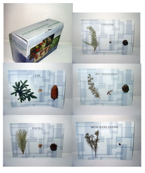 В коллекции представлены 5 видов голосеменных растений (сосна обыкновенная, кипарис, лиственница, ель, можжевельник)  в виде натуральных объектов – ветки, семена,  шишки (кроме ветки ели), наклеенных на планшеты, с обратной стороны планшетов есть картинки и пояснительный текст к данному растению. Наиболее целесообразно использовать коллекцию в качестве раздаточного материала, предложив учащимся следующие задания: рассмотрите внешнее строение побегов; рассмотрите строение шишек; рассмотрите семена; в чем различие и сходство побегов, шишек, семян; как распространяются семена этих растений; как семена расположены в шишках. Коллекция может быть использована в курсе природоведения и географии при изучении различных природных зон.