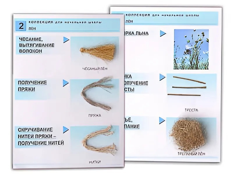 Образцы льняных волокон, пряжи, нитей и тканей размещены на картонных ламинированных планшетах. Сопровождаются краткими пояснениями технологии переработки льна.