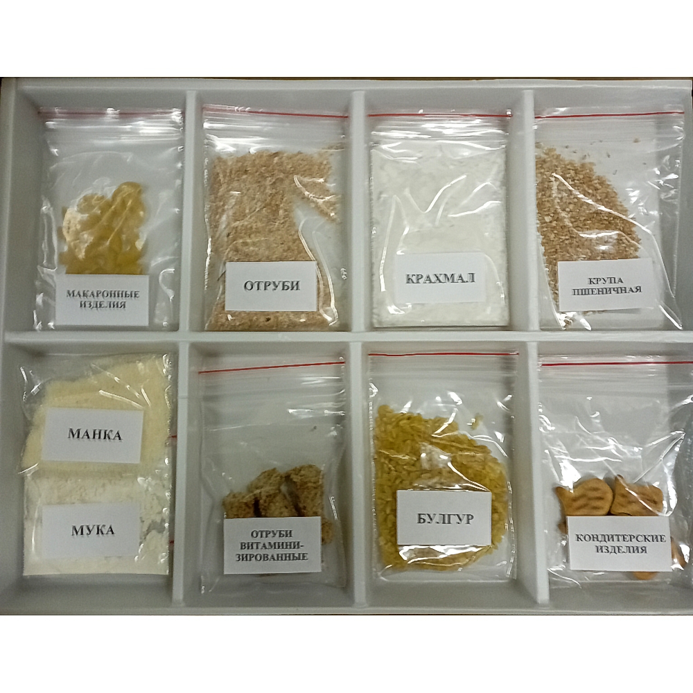 Образцы продуктов переработки пшеницы представлены следующими наименованиями: булгур, крахмал, крупа пшеничная,  манная крупа, отруби, отруби витаминизированные, мука, макаронные изделия, кондитерские изделия. Коллекция упакована в коробку.