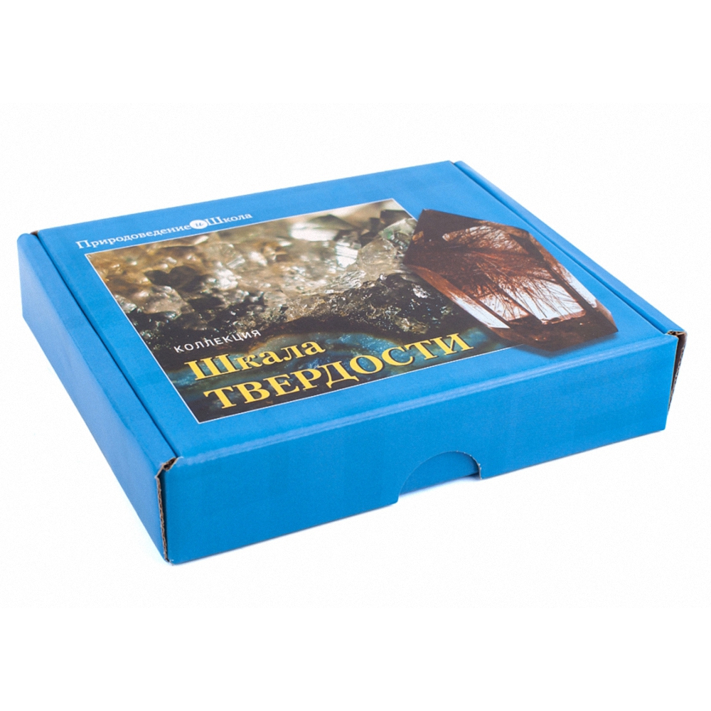 Коллекция «Шкала твердости» предназначена для использования в общеобразовательных учреждениях на практических занятиях при изучении курса природоведения, географии и химии, а также для кружковой работы по геологии.   В коллекции представлены 9 минералов с постоянной твёрдостью от 1 до 9. Они не предназначены для испытаний. Коллекция снабжена списком с наименованием образцов. Номер в списке соответствует твёрдости образца. Указания по определению твёрдости образцов минералов, предназначенных для испытания, указаны в приложении к коллекции. Опыты можно проводить как в школе, так и в полевых условиях во время экскурсий. Для испытаний подбираются образцы в полевых условиях или из раздаточных коллекций.