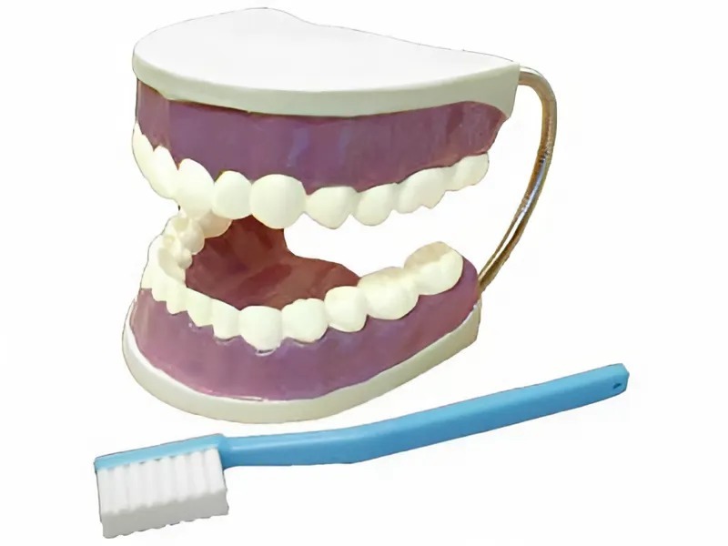 Модель демонстрирует строение челюстей человека (масштаб 5:1). Изготовлена из пластмассы и снабжена подвижными металлическими креплениями, позволяющими демонстрировать строение зубов, а также правила ухода за ними.