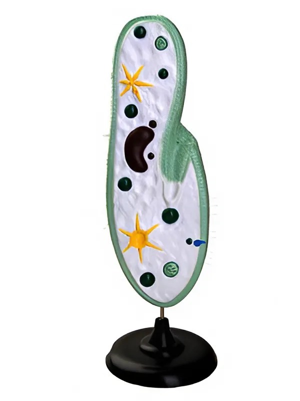 Демонстрирует внешнее и внутреннее строение инфузории-туфельки. На модели представлены следующие детали строения простейшего: реснички, передняя сократительная вакуоль, макронуклеус (большое ядро), цитоплазма, пищеварительная вакуоль, передняя сократительная вакуоль, цитостом (рот), глотка, перистом (предротовая полость), микронуклеус (малое ядро), пелликула (наружная оболочка).
