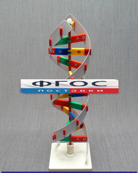 Модель представляет собой многократно увеличенный виток спирали ДНК. На модели приняты следующие условные обозначения: - остаток фосфорной кислоты - белые ленты, расположенные спирально на периферии модели; квадрат красного цвета - дезоксирибоза; -цветные прямоугольники - азотистые основания (аденин, гуанин, цитозин, тимин). Модель выполнена из пластмассы и установлена на пластмассовую подставку. Высота модели не менее 41 см.